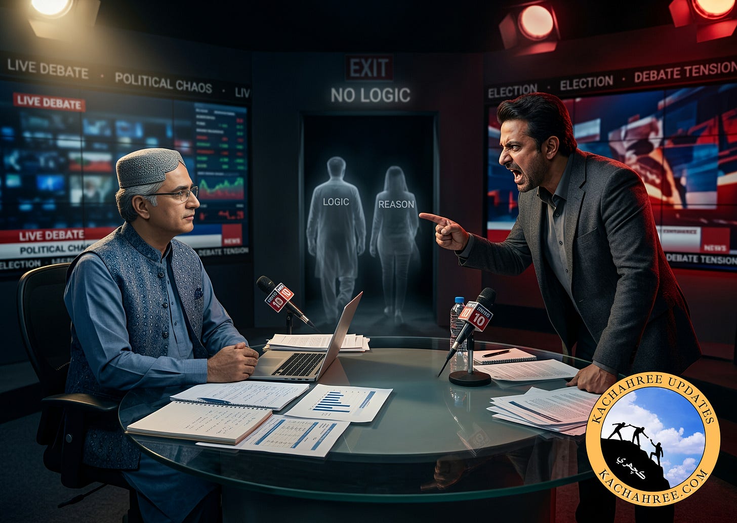 سنڌ جي ڪنهن به مشهور نيوز چينل تي پرائم ٽائيم ٽاڪ شو جو منظر نامو اڪثر هڪ ئي هوندو آهي. شروعات ۾ هڪ مهمان وڏي تياريءَ سان انگن اکرن ۽ حقيقتن جا دفتر کولي ويهندو آهي. هو پنهنجي دليلن سان سامهون واري کي اهڙي نموني ڪنڊائتو ڪري ڇڏيندو آهي، جو لڳندو آهي ته هاڻي سچ ظاهر ٿيڻ وارو آهي. پر بلڪل ان گهڙيءَ، جڏهن جوابي دليل ختم ٿي ويندا آهن، تڏهن عقل ۽ منطق خاموشيءَ سان پويان دروازي کان ٻاهر نڪري ويندا آهن ۽ بحث جو رخ مڪمل طور تي مٽجي ويندو آهي.